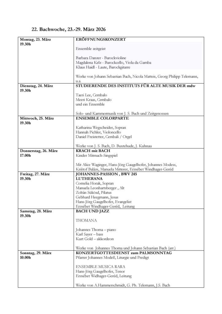 Am Donnerstag lädt „Krach mit Bach“ zum Kinder-Mitmach-Singspiel. Höhepunkt ist am Freitag die Johannes-Passion, BWV 245 mit LUTHERANA unter der Leitung von Erzsébet Windhager-Geréd. Am Samstag verbindet THOMANA Bach mit Jazz. Den Abschluss bildet am Sonntag ein festlicher Konzertgottesdienst zum Palmsonntag mit Werken von Andreas Hammerschmidt, Telemann und Bach.