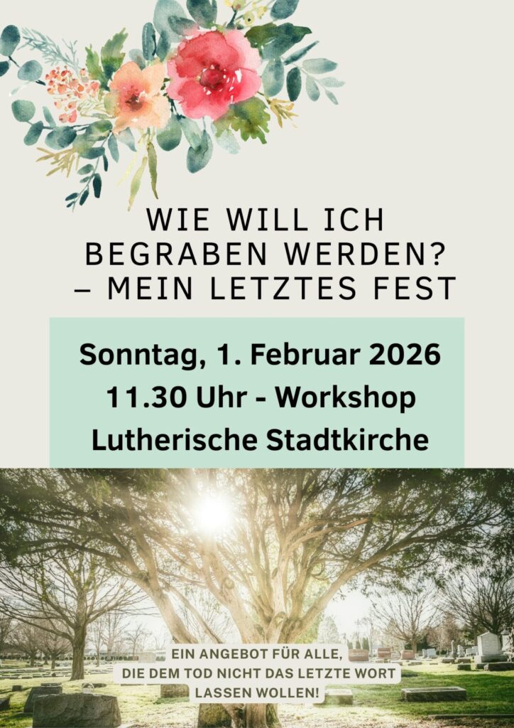 In diesem Workshop nehmen wir uns Zeit, über das eigene „letzte Fest“ nachzudenken – über Abschiednehmen, Gestaltungsmöglichkeiten, Trauer und Trost. Denn wer seine Wünsche kennt und teilt, entlastet die Hinterbliebenen. Für Angehörige ist es tröstlich, im Abschied etwas gestalten zu können, das dem Menschen wirklich entspricht. Eine Zeremonie, die nicht „von der Stange“ kommt, sondern Persönlichkeit, Glauben, Humor und Lebensweg spürbar werden lässt, kann Trauer verwandeln – in Dankbarkeit.